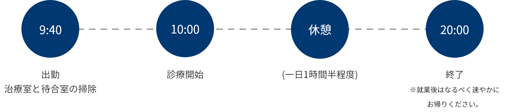 当院では、スタッフ全員が短い時間で効率的に仕事をこなすよう心がけています。それぞれの業務や休憩はしっかりメリハリをつけ、最小限の時間で最大限の成果を出すのが当院のモットーです。