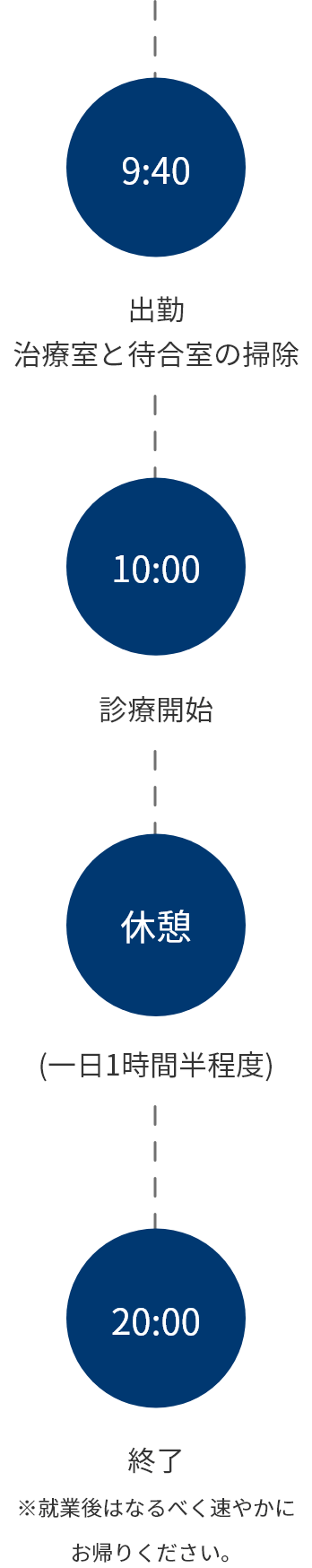 | 診療時間 | 月~水 金 10:00~20:00 木 10:00~14:00 土日祝 9:00~18:00 固定残業代有 ※通勤手当・通勤距離に応じて支給 ※引越し手当あり |